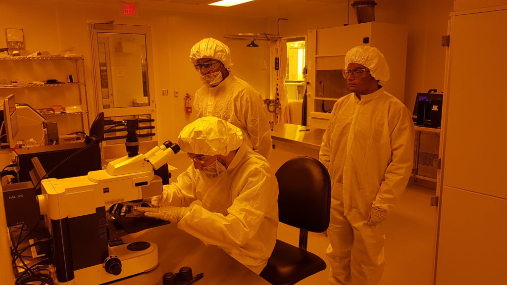 Graduate students in ELEC 856, Intro to Nanophotonics, got a taste of nanofabrication at NFK in October. NFK staff demonstrated a full liftoff process with maskless photolithography over several visits, but students were able to get involved and turn a few knobs. In the photo, Hugh Morison is preparing the patterned wafer for microscopy as Umer Kamran and Muhammad Saad Asad look on.